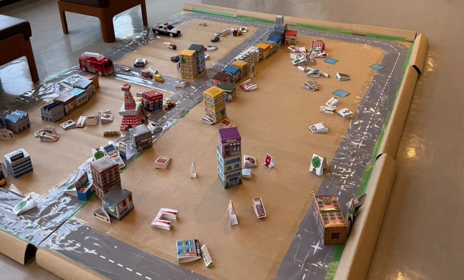 実際にはダンボールで作った建物を思いきり壊して走らせることが面白かったようで、笑顔と歓声が溢れていました。